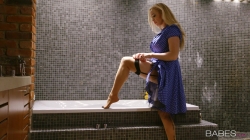В ролях: Ella Hughes, Rebecca Moore  Устроившись на диване, молодая парочка смотрела телевизор, но девушке очень быстро надоел этот процесс и она начала ласкать шею своего парня и ручками лезть к нему в штаны.  Всё бы так и продолжалось и возможно эта ситуация нашла бы своё логическое и сексуальное продолжение. Если бы в зал не зашла мама девушки проверить, чем занимается юная парочка, немного обломав молодых. Через некоторое время девушка уснула, парень решил пойти домой. Но, выходя он наткнулся, на провокационно открытую дверь в ванной комнате, откуда доносился шум воды. Он понимал, что в доме кроме его девушки и её мамы никого нет, тут его любопытство взяло над ним верх, он тихо подошёл к двери и стал подглядывать. Он видел, как раздевается сексуальная мамаша его девушки, обнажая свои красивые и пышные формы. Спустя несколько минут мамочка увидела, что за ней подглядывают, и позвала парня к себе поближе. Недолго думая, наглая мамаша соблазнила и занялась сексом с парнем дочери прямо в ванной под шум воды. Парень сразу же принялся делать куни этой сексуальной блонде, но длилось это недолго. В ванную зашла её дочь и обнаружив своего парня, который пытался спрятаться устроила скандал. Но, уверен это не последняя попытка мамочки отбить парня у дочери, очевидно, что парень ей понравился и она захочет продолжения. |